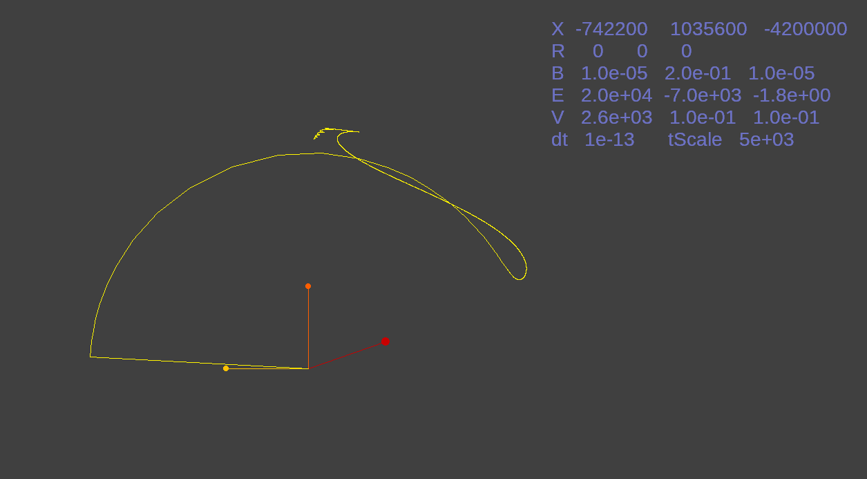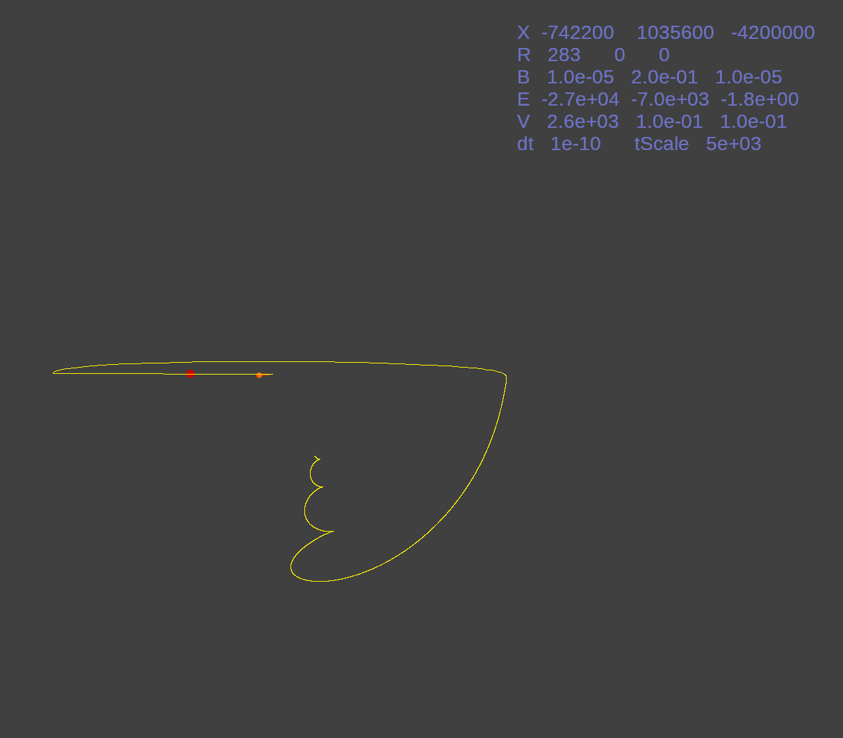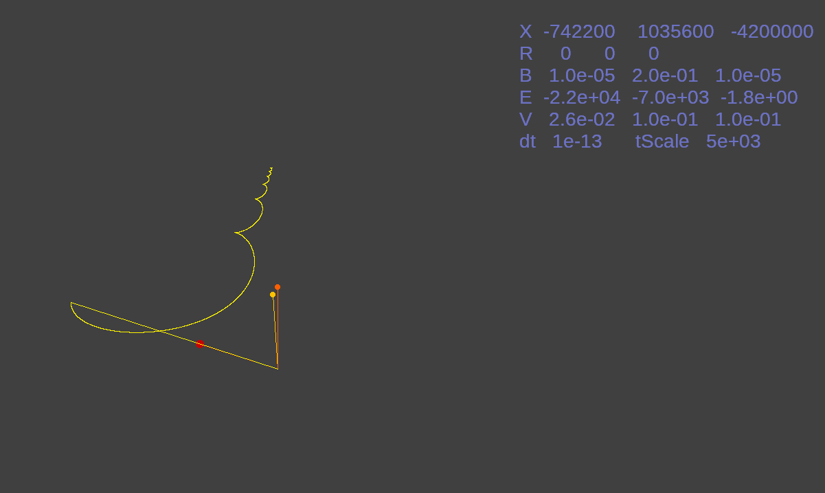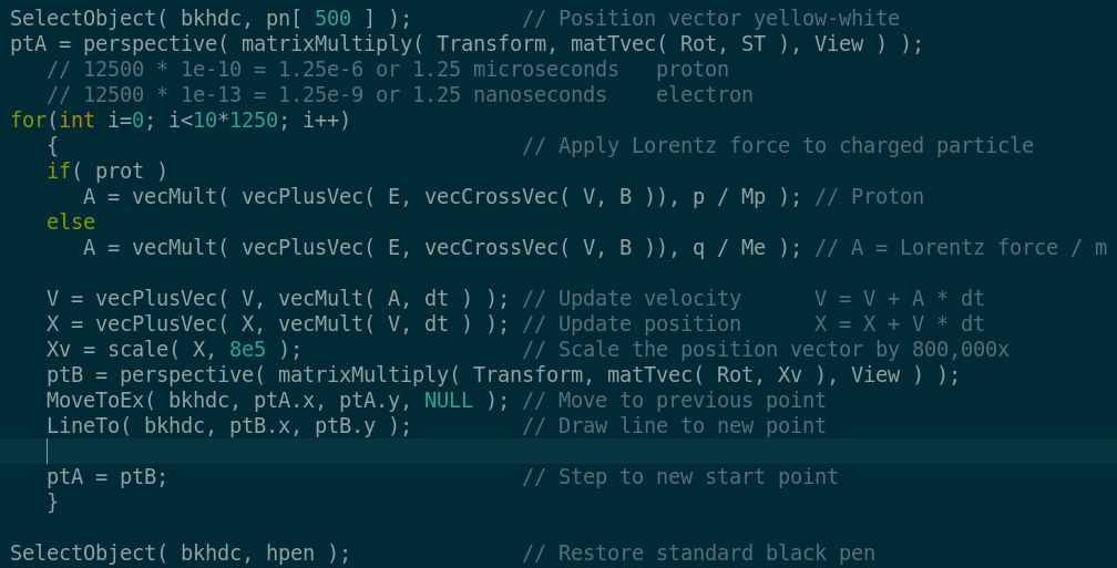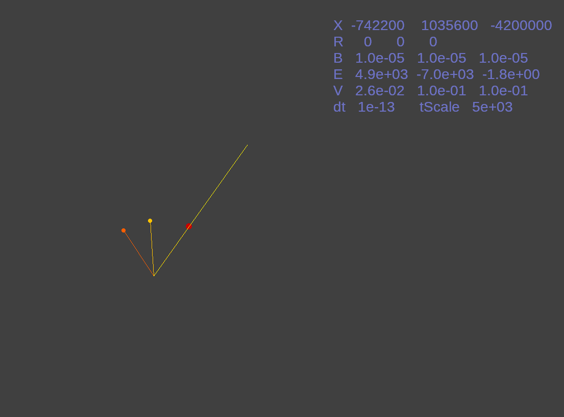 This let me find a useful time interval. I chose 1/10 of a picosecond as dt, or 10^-13 seconds. I wrote some more code and got the Lorentz() function working in my 3D graphics environment.
