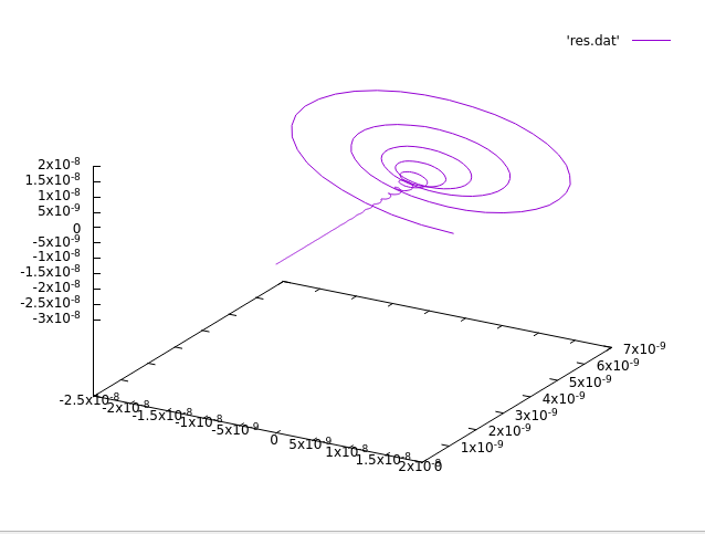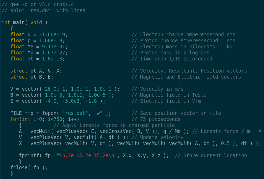 I was curious how an electron moves in a magnetic field. So I dug out my physics books and worked some problems. After reviewing the basics I settled on the Lorentz force equation. Force = q ( E + V cross B ). Here q is the charge of an electron, E is the electric field vector, V is the velocity vector, and B is the magnetic field vector. I use + to represent vector addition, and cross to represent the cross product between V and B. Multiplying a vector by a scalar was implied when the charge was applied to the vector. Now that I had my equation I needed to find out how it responded to various inputs. I wrote a little code to generate test data.