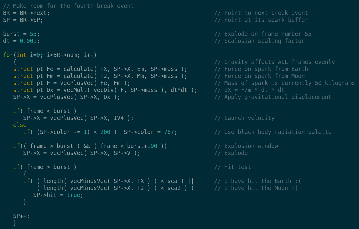 Lastly, we check if the particle has hit either the earth or the moon. If it has hit either of them it is no longer displayed during the simulation.