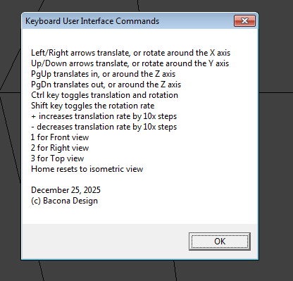 The magnetic vector, B, begins at 1 Gauss, 1e-5 Tesla, for each component. This is an artifact of having both apps running in concert with one another. Hit the F key to step the B.y component value. The magnetic field now points down, similar to the Earth's magnetic field. Once you have stepped the magnetic vector it never returns to the 1 Gauss setting. It steps by 0.2 Tesla until it reaches 3.6 Tesla. Then it returns to 0.0, with 1e-5 Tesla for the other coordinates.