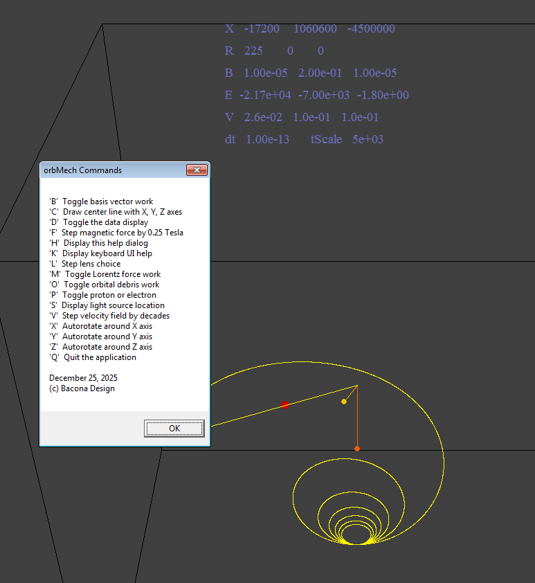 The V key controls the X component of the velocity vector. Each time you hit it the velocity increases by a factor of ten. V.x begins at 2.6e-2, 0.026 meters/second or 26 millimeters/second. Keep hitting the V key to achieve ever greater velocity. The limit is 2.6 million meters/second, which is sufficient for this exercise; to find the limits of interest of the Lorentz function.