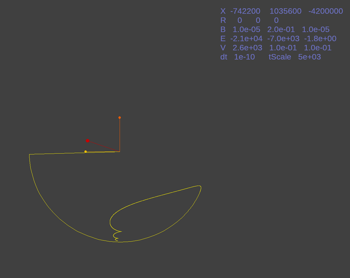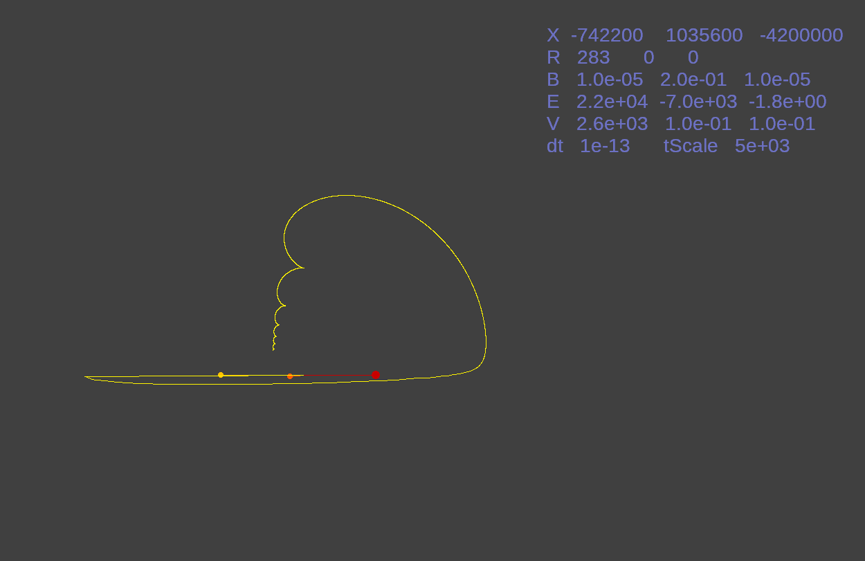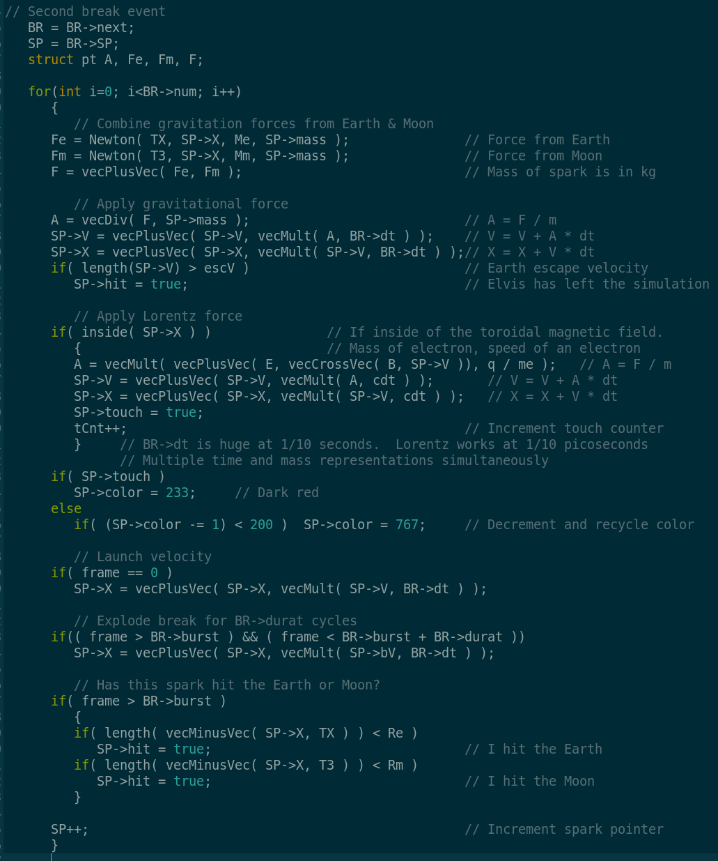 Notice how the break behavior is changing. The force of gravity on each particle is calculated for both the earth and the moon. Then they are summed and Newton's laws of motion are applied to find the new location. Next the Lorentz force is calculated if the particle (electron) is inside of the earth's magnetic field, designated by the torus. Once the force is determined Newton's laws of motion are applied again.